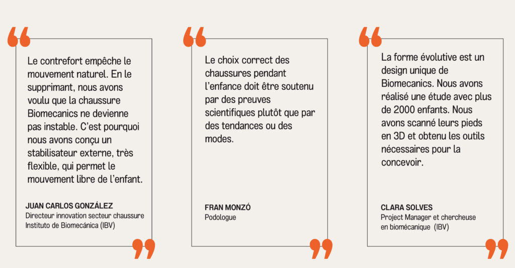 Pour nous, la science et l’Institut de Biomécanique (IBV) nous donnent les clés pour concevoir une chaussure adaptée et respectueuse de leurs pieds ; car les pieds ont besoin de liberté et de respect, oui — mais aussi de qualité, d’ajustement, de protection, de confort et de durabilité. Et pour nous, réunir tout cela dans nos chaussures, afin que vos petits puissent grandir avec elles, est la chose la plus naturelle.